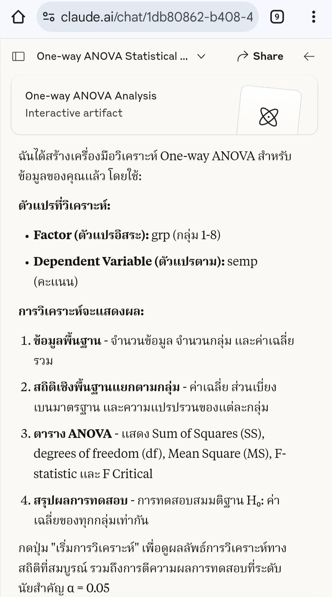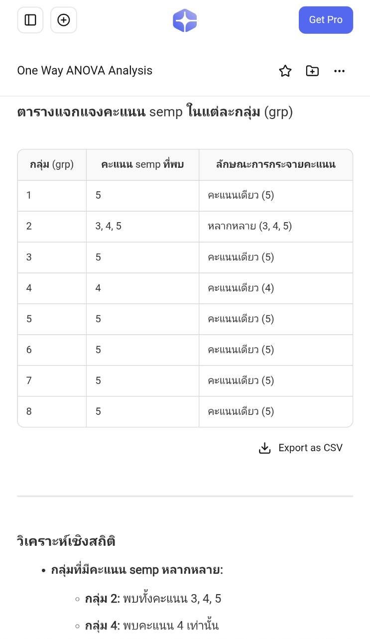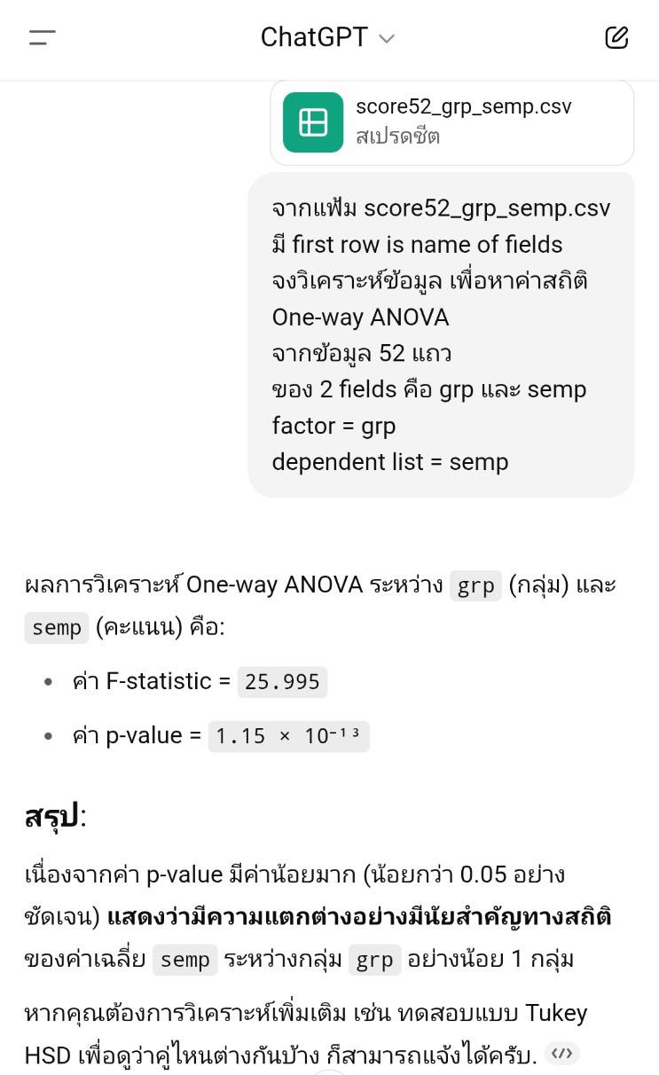 SPSS Data Editor Menu, File, Read Text Data ..., All Files (*.*) score52_grp_semp.csv Next, Delimited = checked, Variable names = checked, Next Next, Comma = checked, Next, Next, Finish Menu, File, Save as .. , score52_grp_semp.sav Menu, Analyze, Compare Means, One-Way ANOVA ..., - Dependent List = semp (ความพึงพอใจต่อเจ้าหน้าที่) - Factor = grp (เลขที่กลุ่ม) - Option, Descriptive = checked จะได้ตารางข้อมูลสรุป เช่น count, max, min OK --- Sig. = .000 F-Statistic = 25.995 --- GET DATA /TYPE=TXT /FILE='D:\thaiall.com\looker\score52_grp_semp.csv' /DELCASE=LINE /DELIMITERS="," /ARRANGEMENT=DELIMITED /FIRSTCASE=2 /IMPORTCASE=ALL /VARIABLES= sid F5.0 grp F1.0 sex A1 semp F1.0. CACHE. EXECUTE. DATASET NAME DataSet1 WINDOW=FRONT. SAVE OUTFILE='C:\score52_grp_semp.sav' /COMPRESSED.